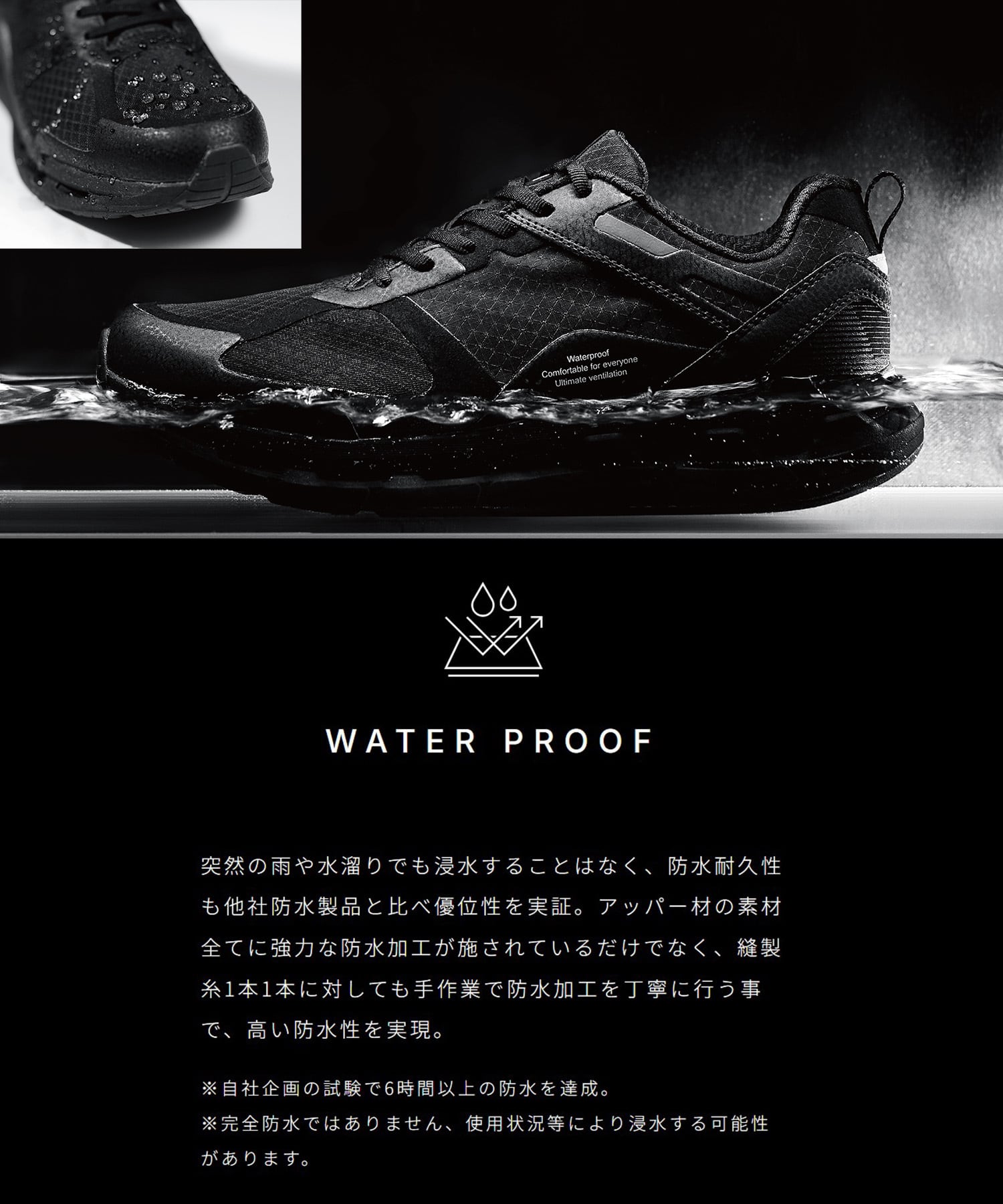 水を通さず、足の甲と足の裏(シューズ全体360°)から空気と水蒸気を逃がすシューズ内環境をいつでも快適に保つ新通気防水システム。