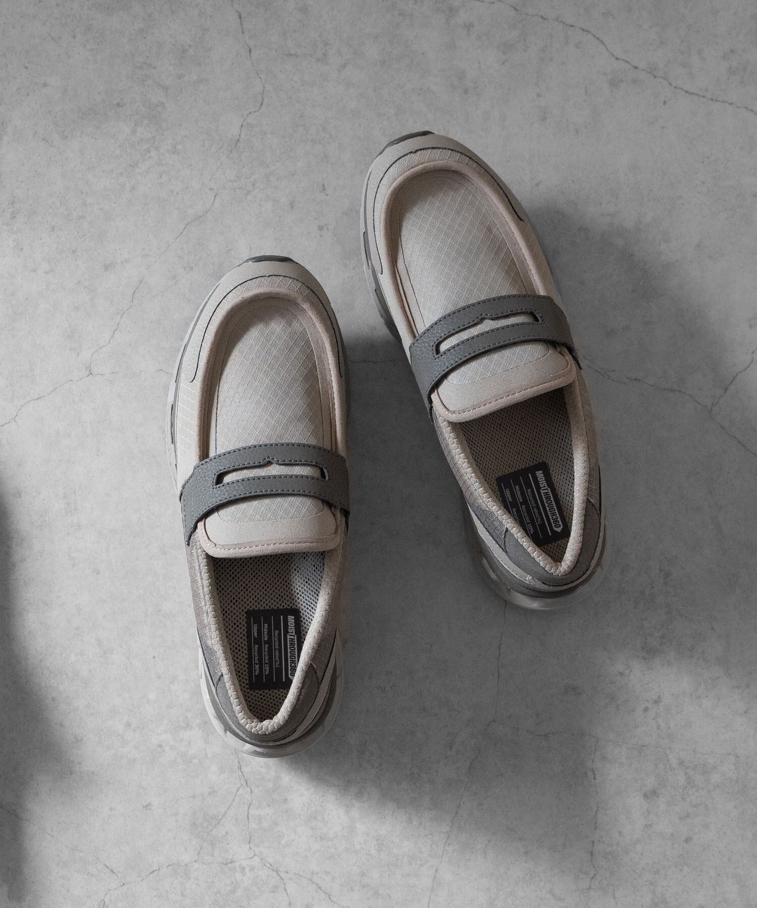 MOISTHROUGH360はそこに焦点をあて、防水フィルムの代わりに、アッパー材の全てに水を通さず空気と水蒸気をしっかりと通すことのできる強力な防水加工が施された特殊素材を用いることで、従来の防水スニーカー同様の防水性を保持しながら、