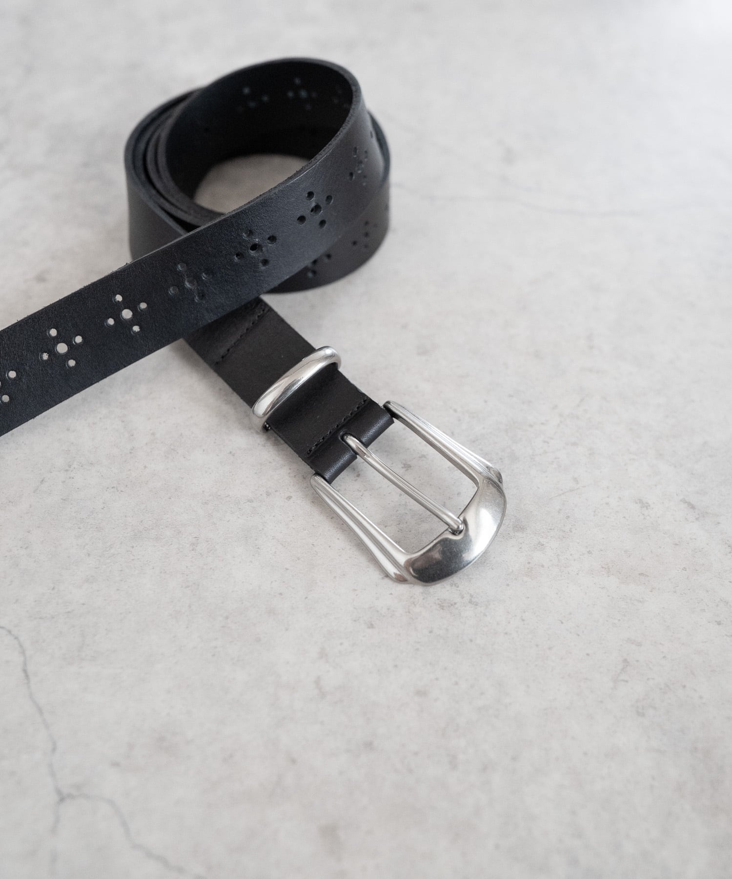 ■ベルト一周に配したメダリオン柄が特徴のロングベルト、どの穴に通しても使用可能