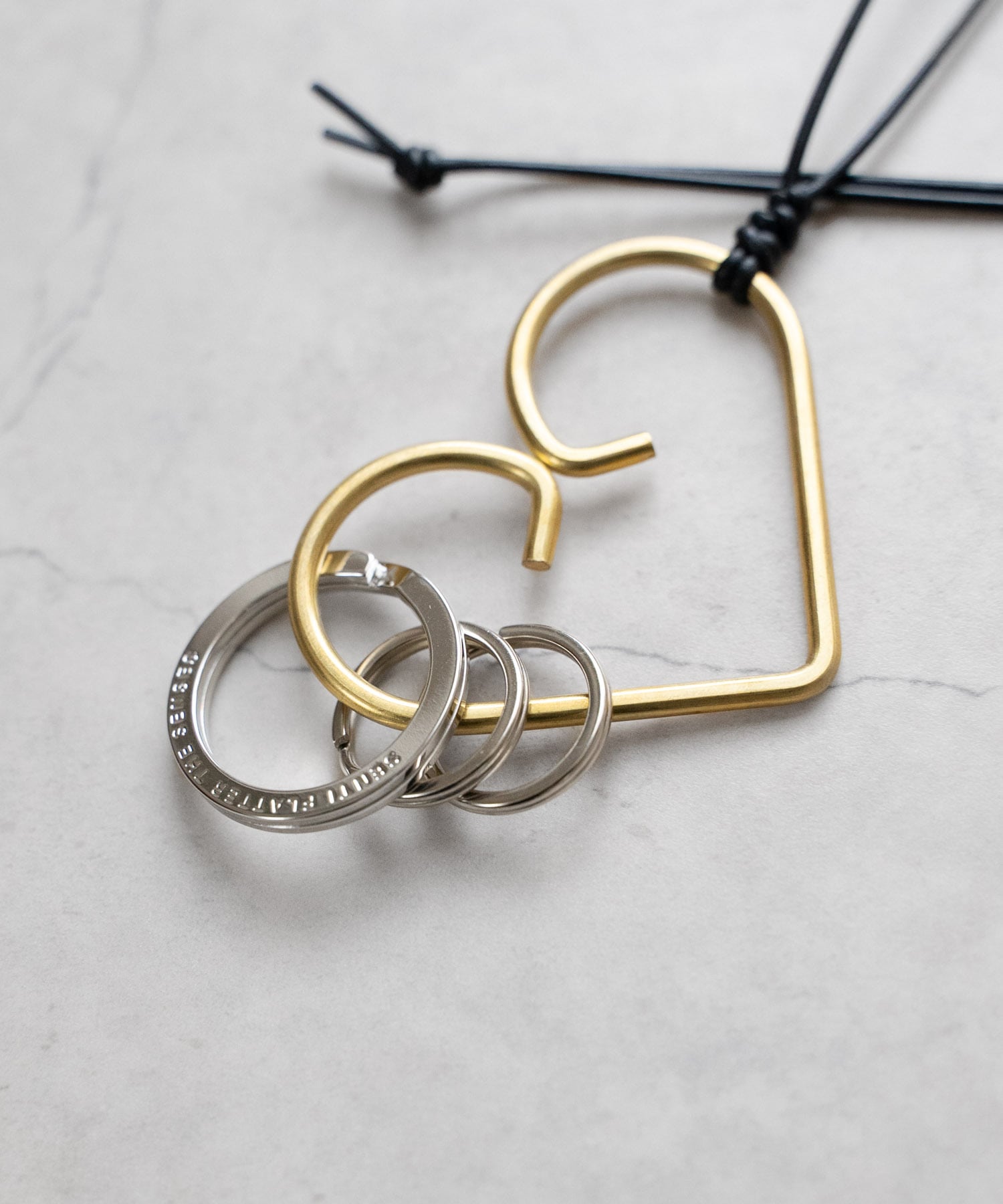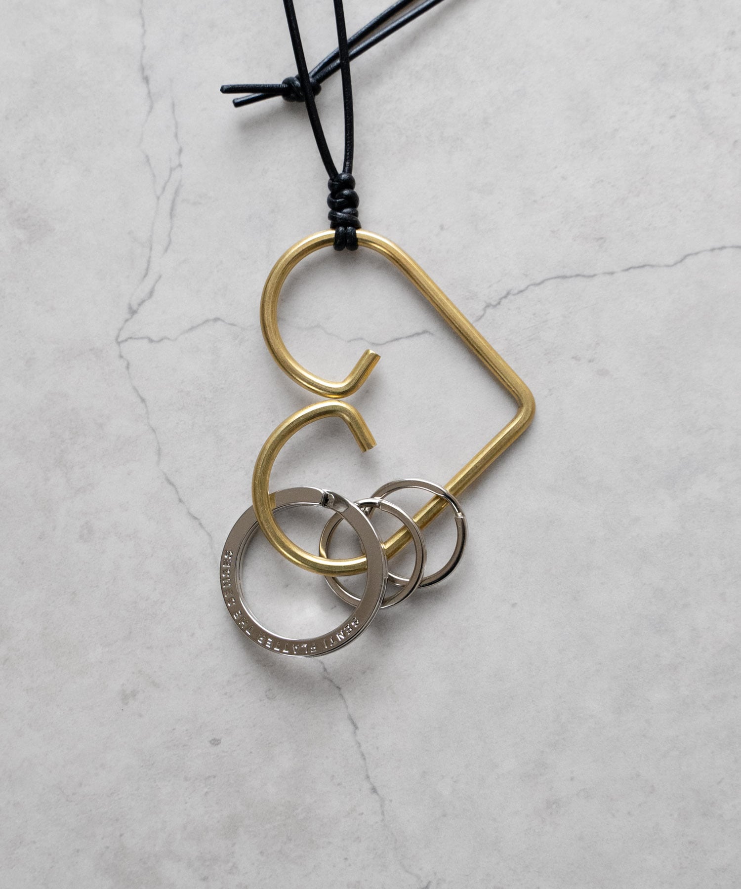 ■ハート型の真鍮製キーリングに2重リングをセットし、レザーコードでネックストラップ仕様に