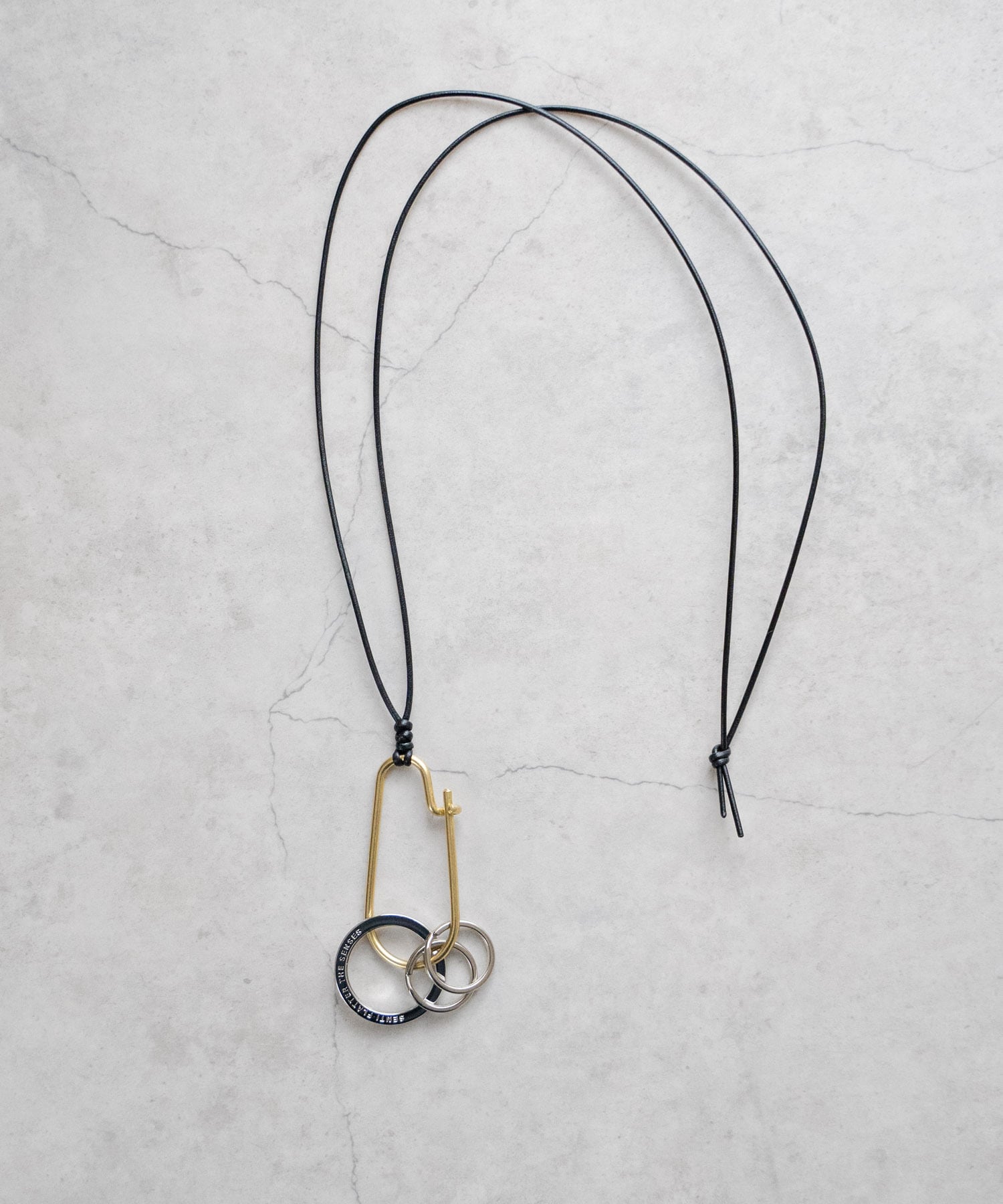 ■オーバル型の真鍮製キーリングに2重リングをセットし、レザーコードでネックストラップ仕様に