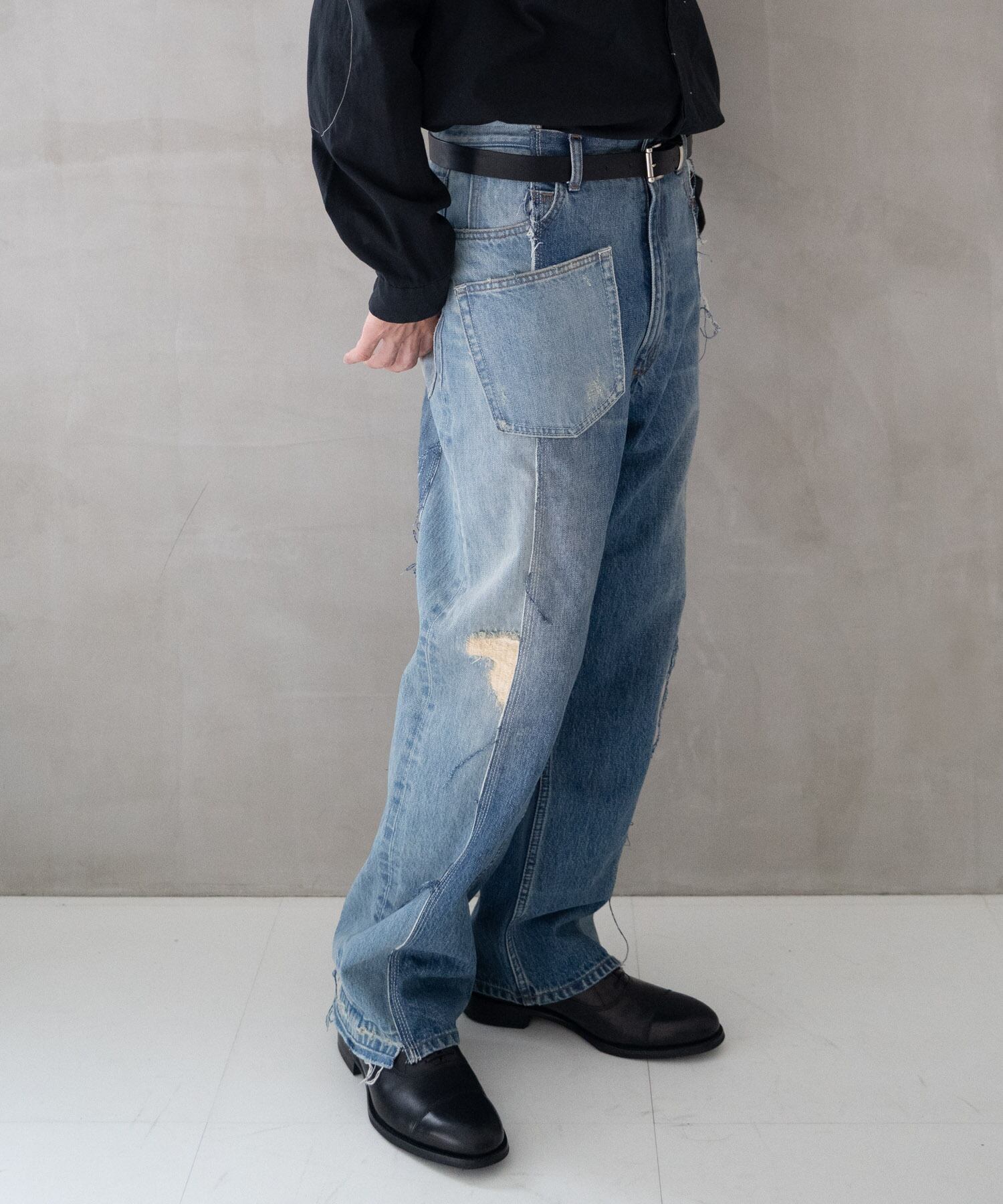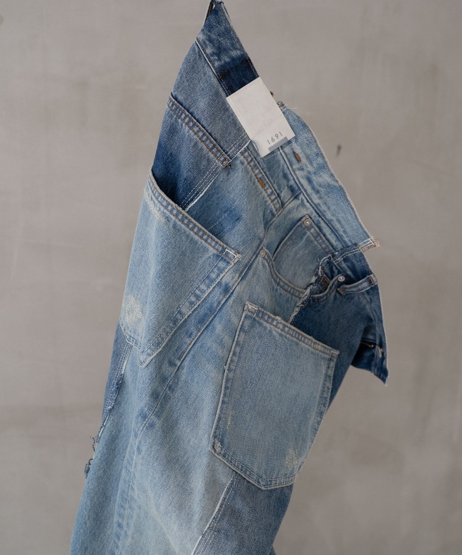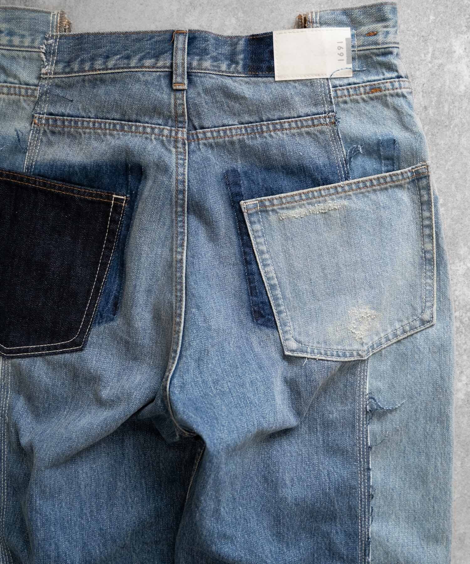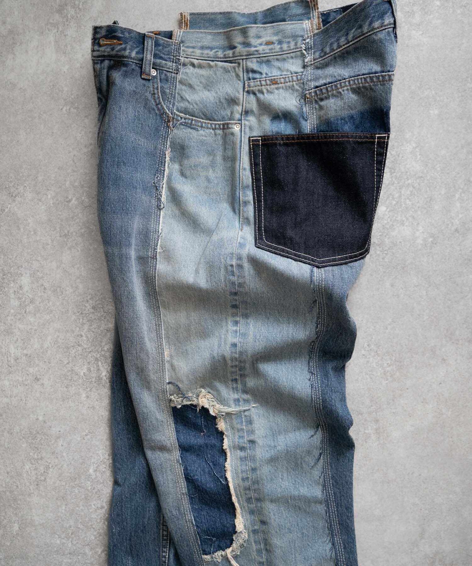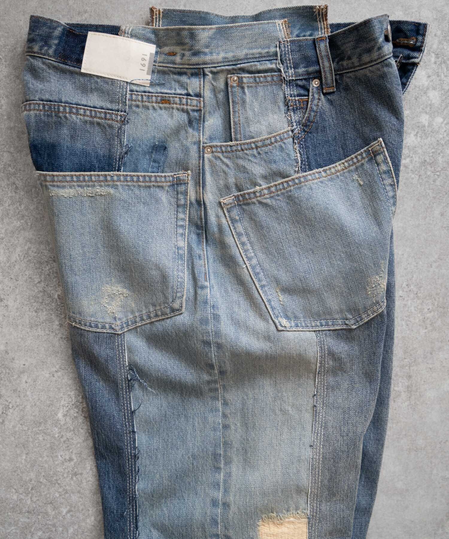 濃・淡(ダメージ&リペア加工済)の2タイプのオリジナルデニムを作成→センターシーム部分で裁断後、パーツ入れ替え・ポケット等の移動も行いオリジナルリメイクデニムとして再構築。