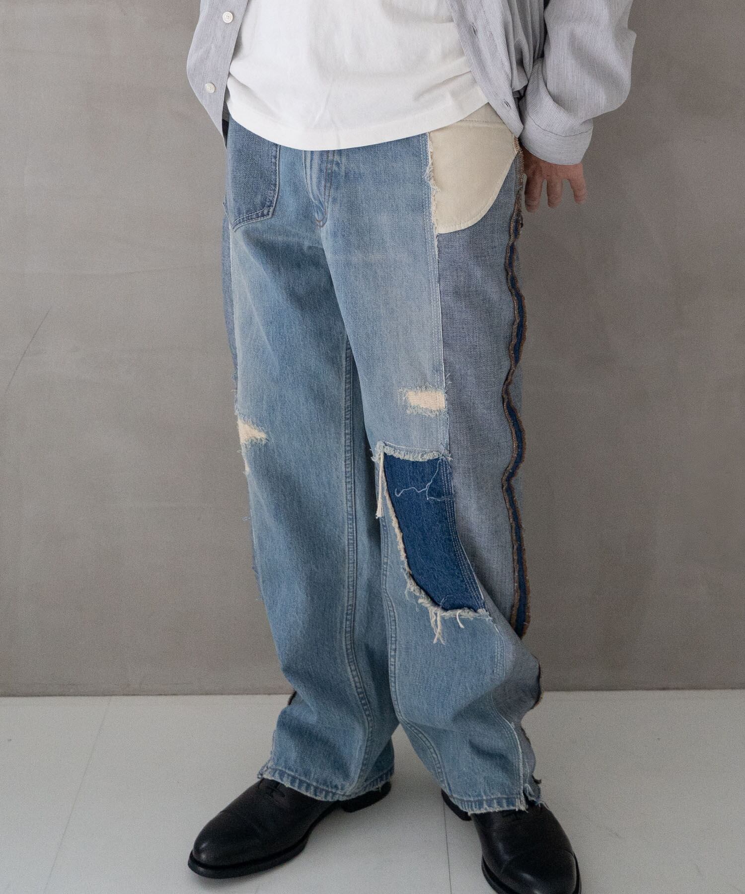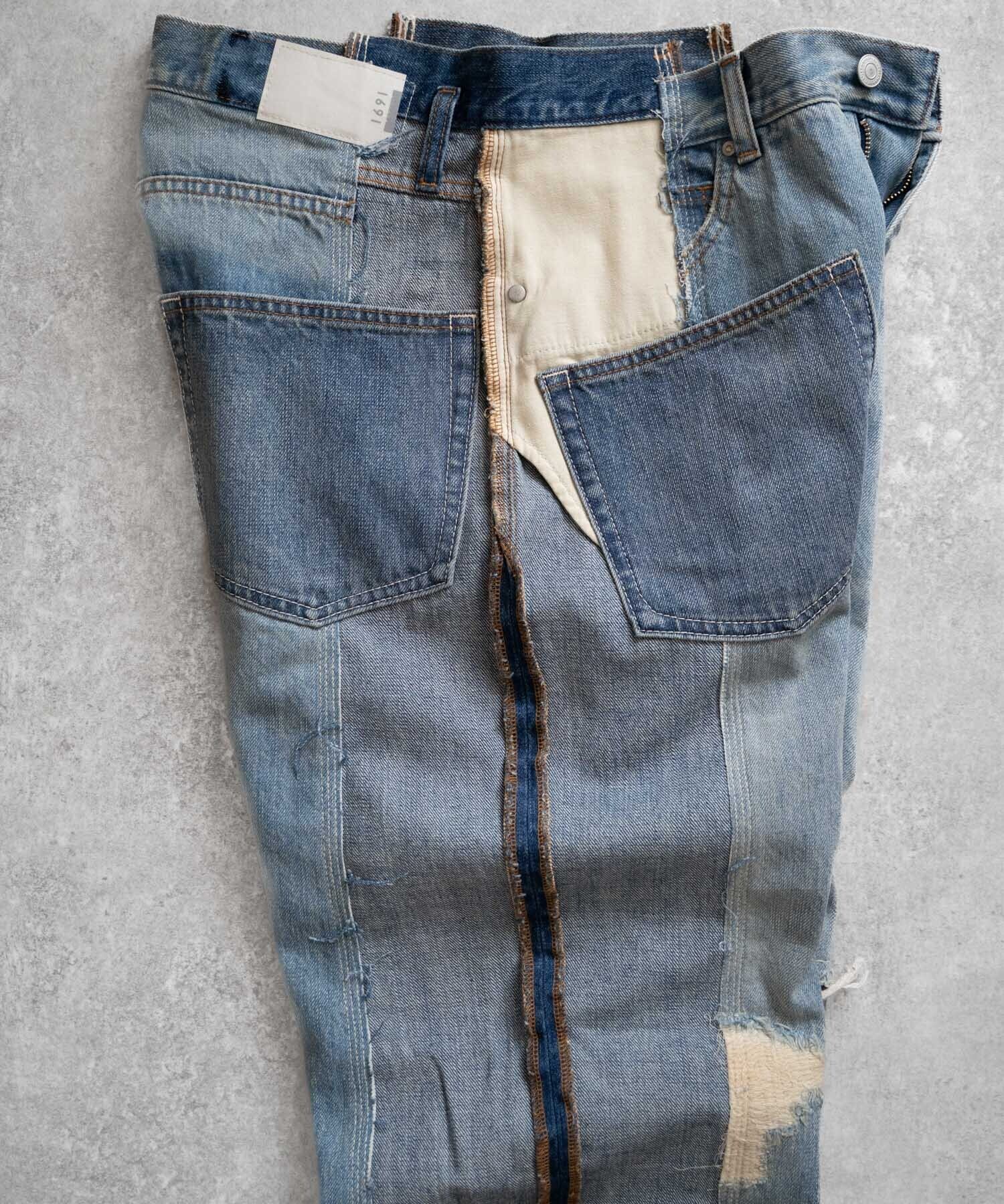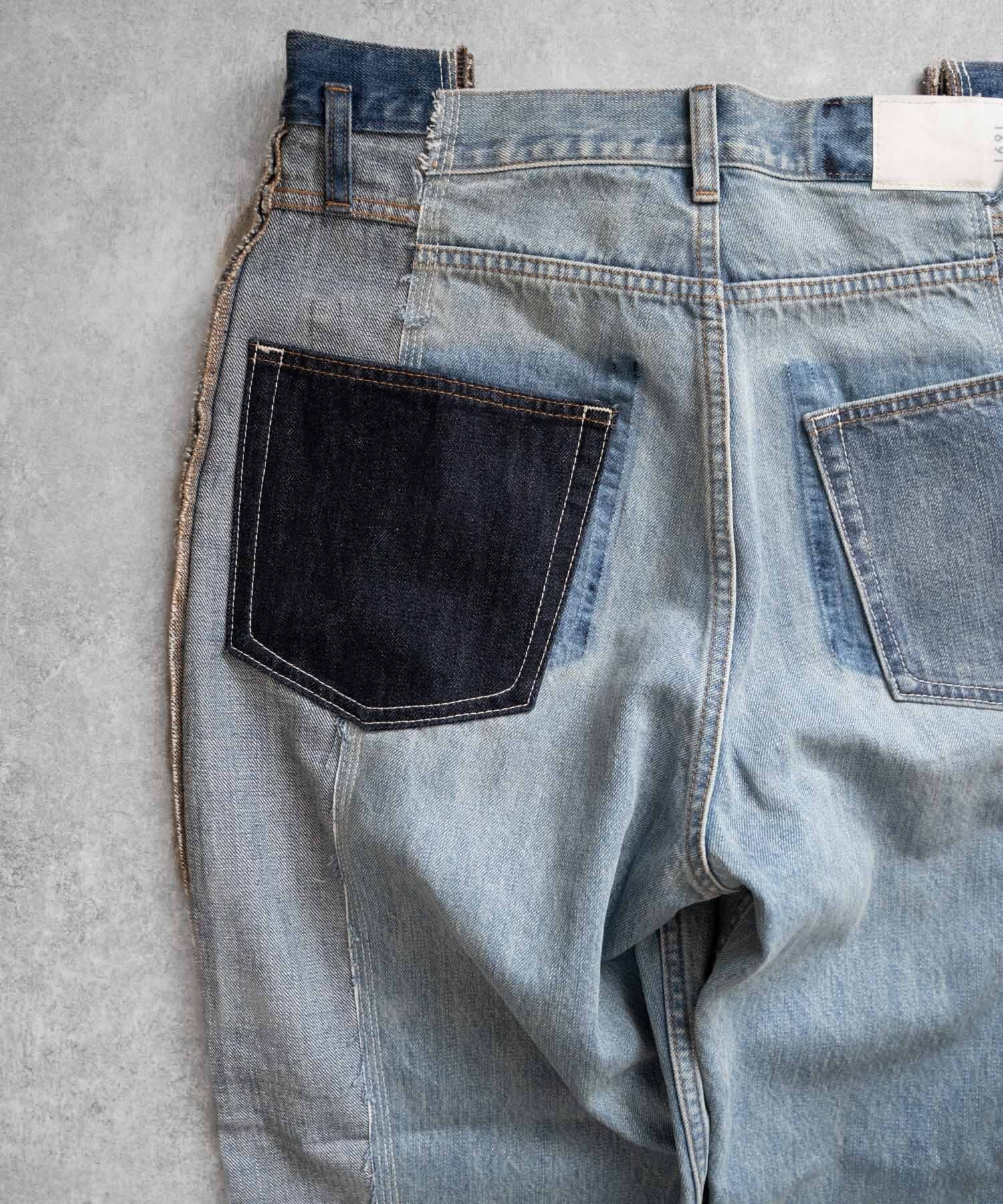 濃・淡(ダメージ&リペア加工済)の2タイプのオリジナルデニムを作成→センターシーム部分で裁断後、パーツ入れ替え・ポケット等の移動も行いオリジナルリメイクデニムとして再構築。