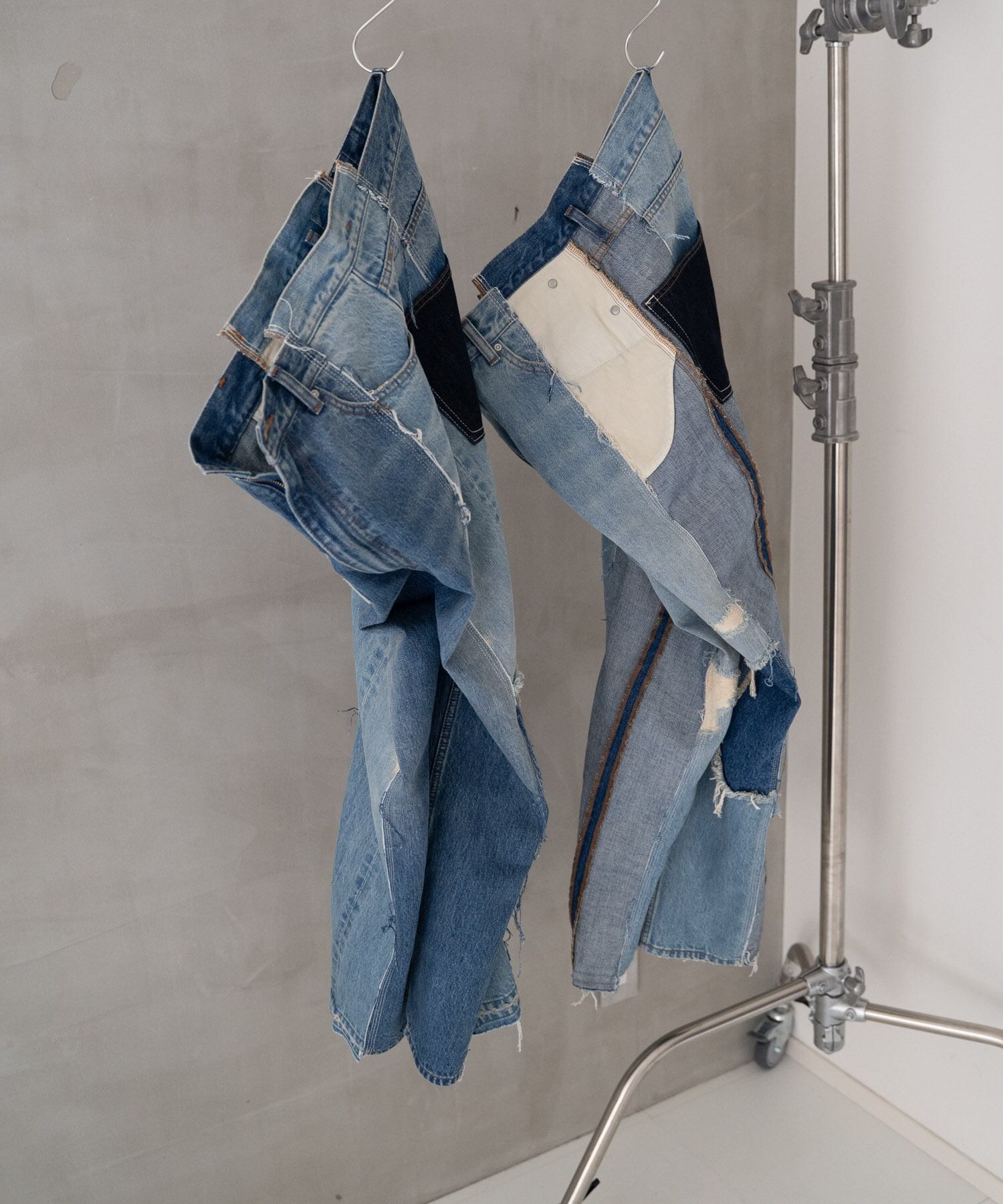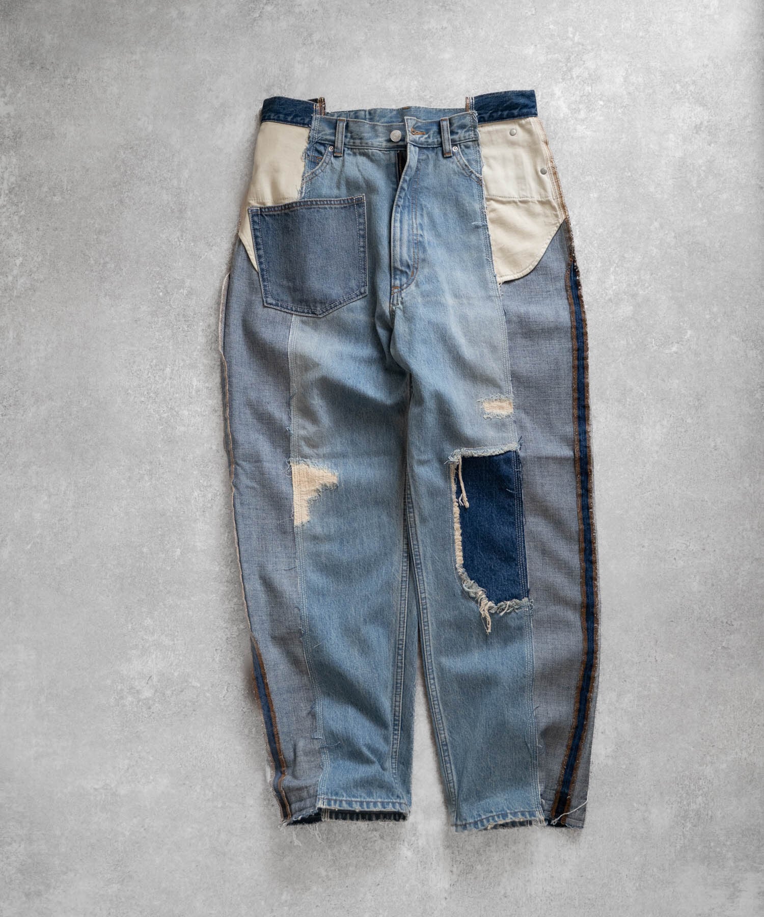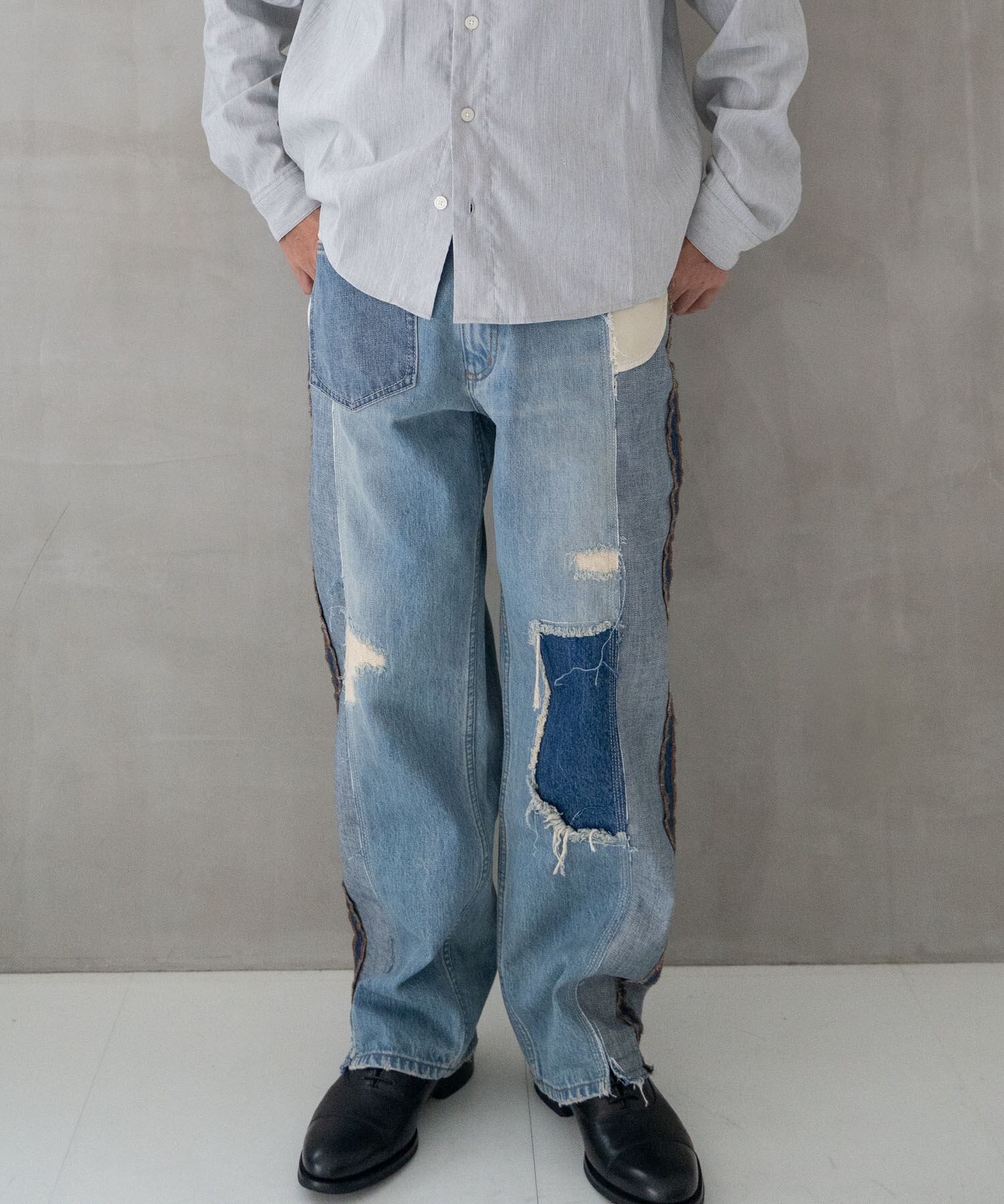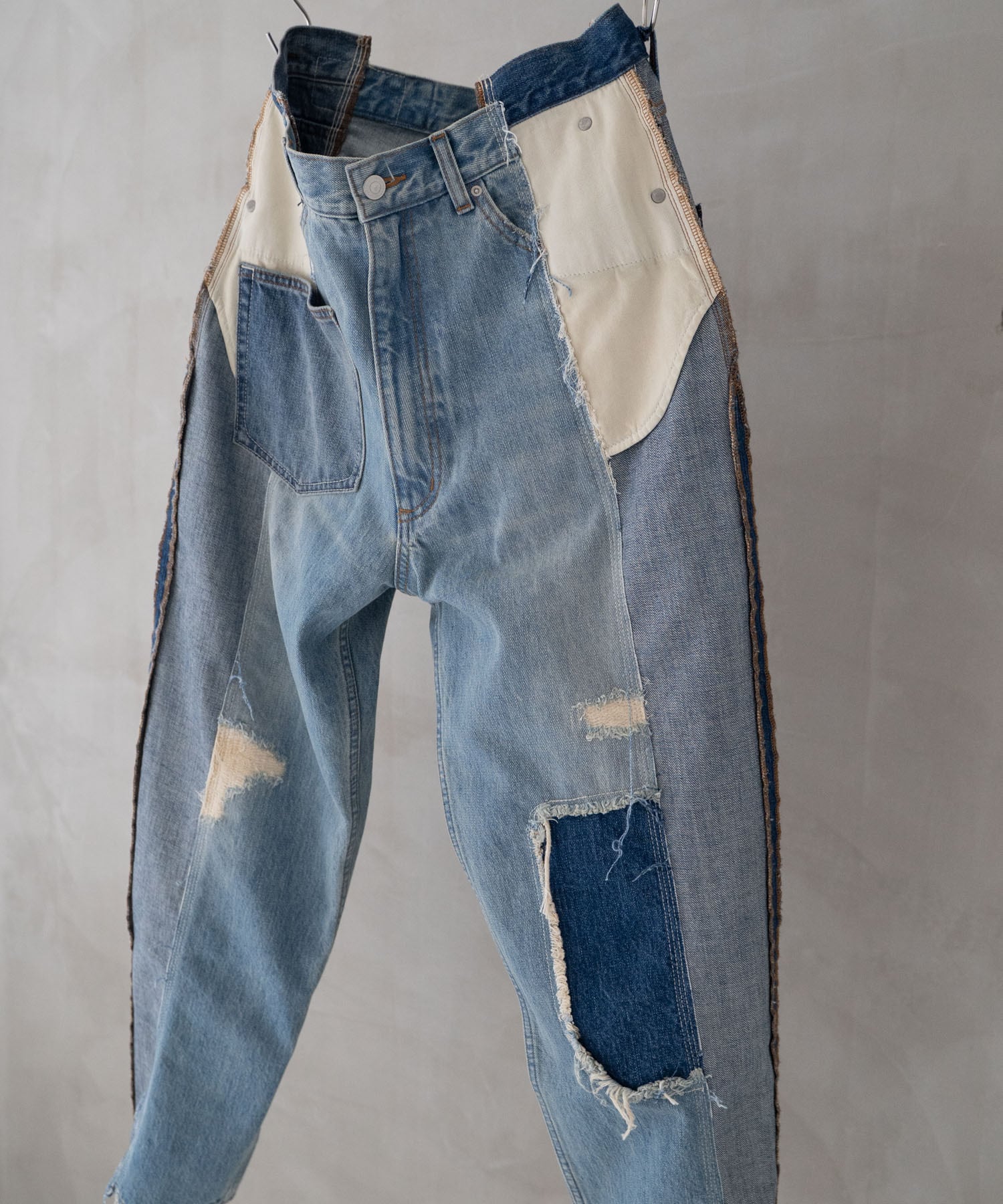 濃・淡(ダメージ&リペア加工済)の2タイプのオリジナルデニムを作成→センターシーム部分で裁断後、パーツ入れ替え・ポケット等の移動も行いオリジナルリメイクデニムとして再構築。