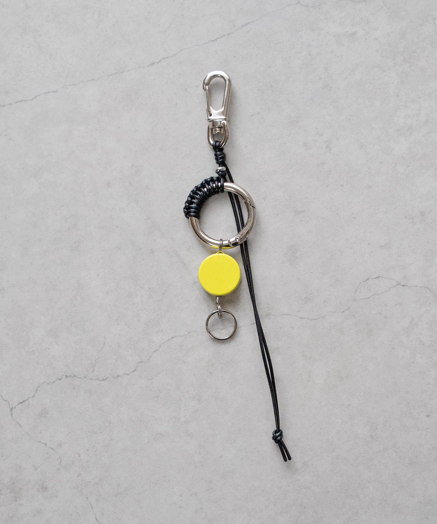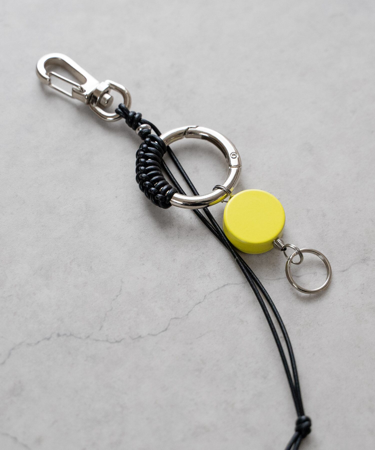 ■カラフルなリールキーと金属パーツを編み込んだレザーコード仕様のキーリング