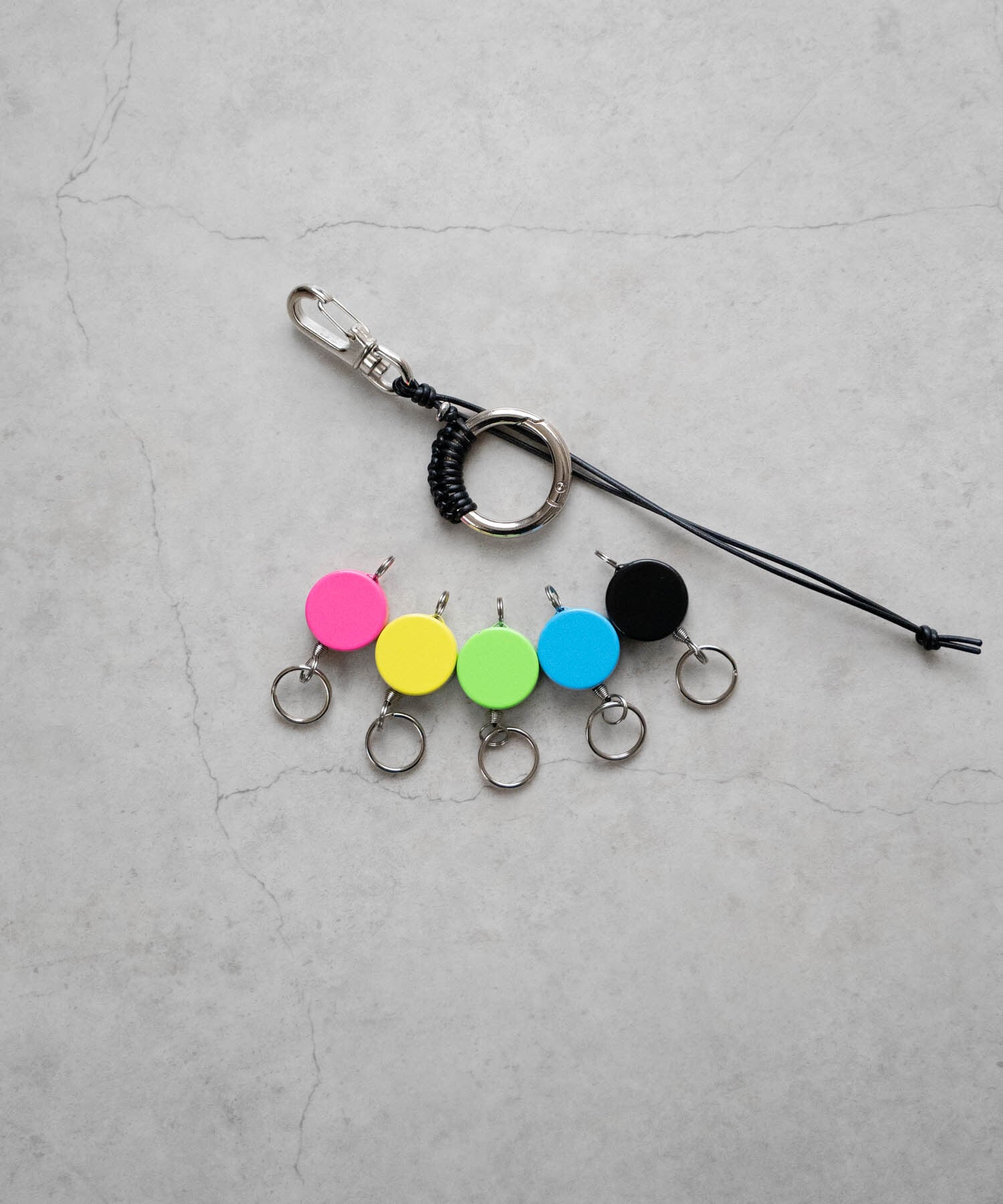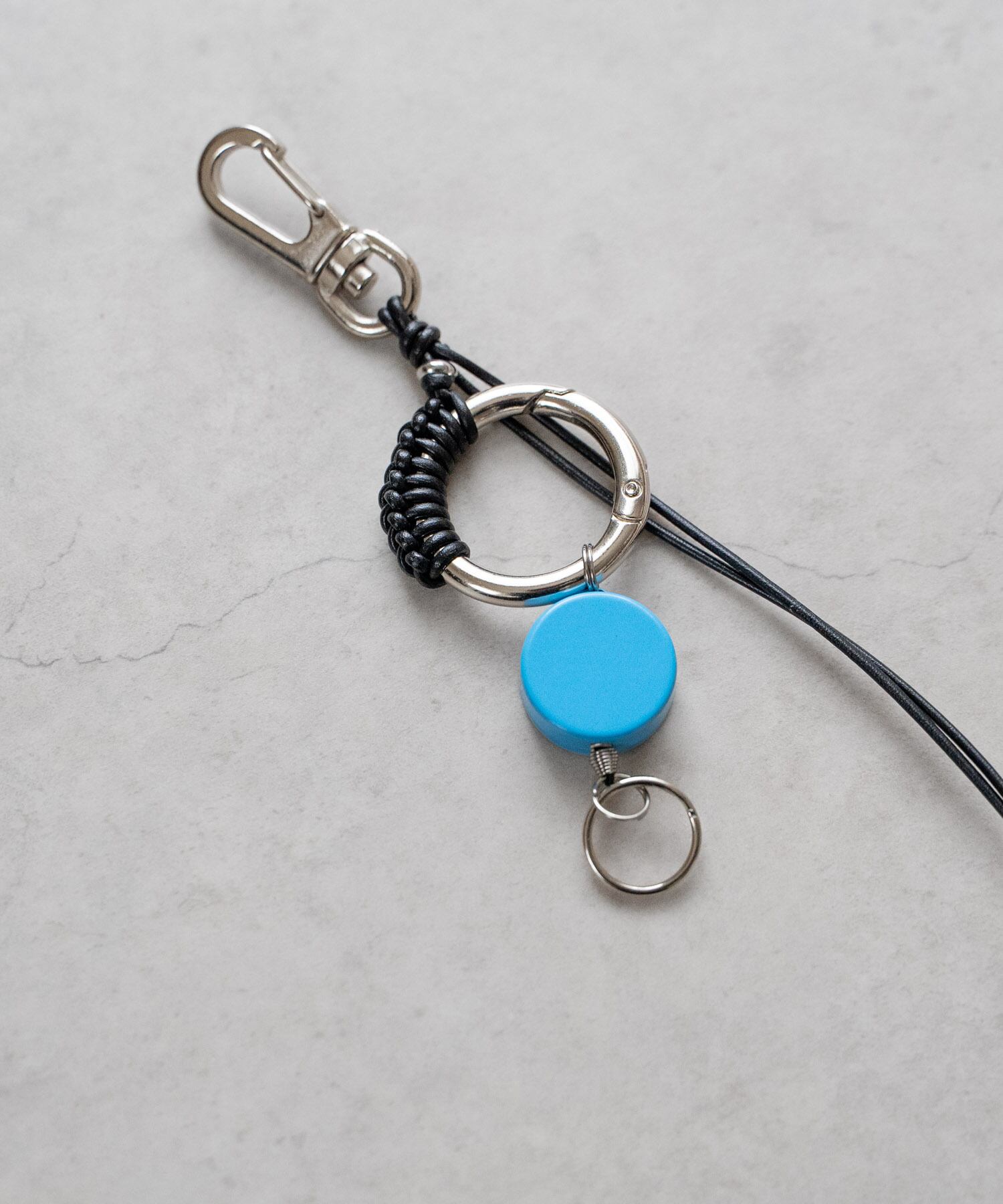 ■カラフルなリールキーと金属パーツを編み込んだレザーコード仕様のキーリング