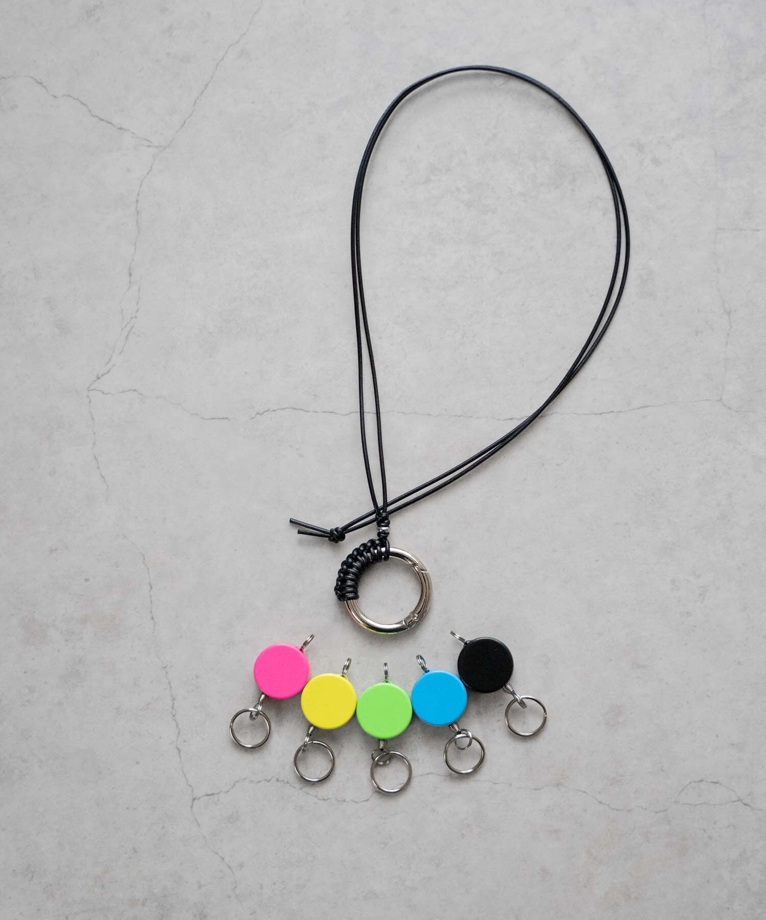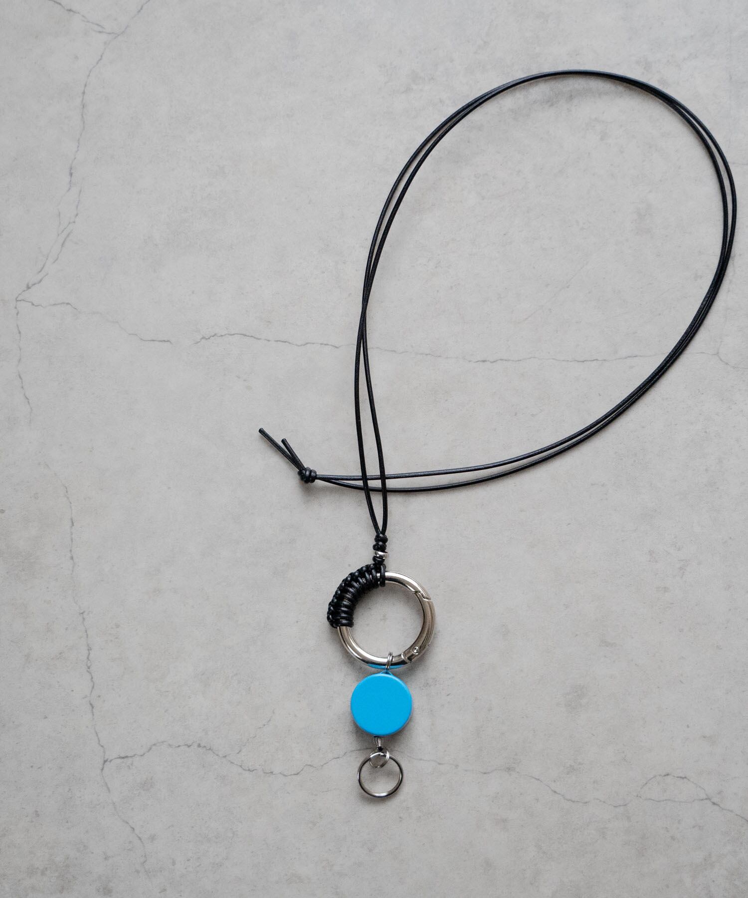 ■カラフルなリールキーと金属パーツを編み込んだレザーコード仕様のネックストラップ