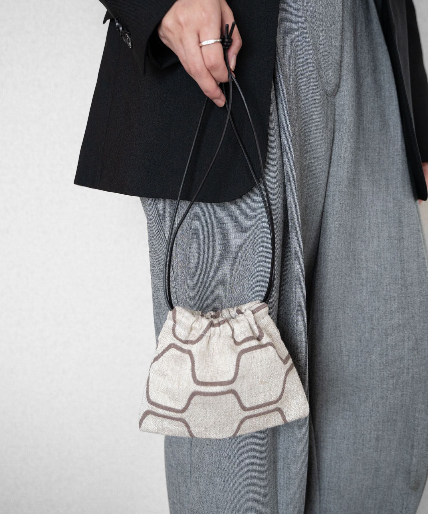 ■Product by dadadaとのコラボレーションアイテム/イタリア製の高級インテリアに使われていたファブリックの一部を使用した、アップサイクルの1点モノ巾着。