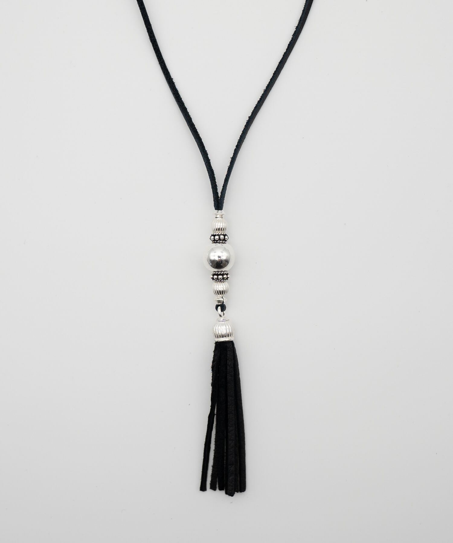 ■シルバーパーツとスエードのレザーコードを使用し、ネイティブ感を残しつつモダンに仕上げたタッセルロングネックレス