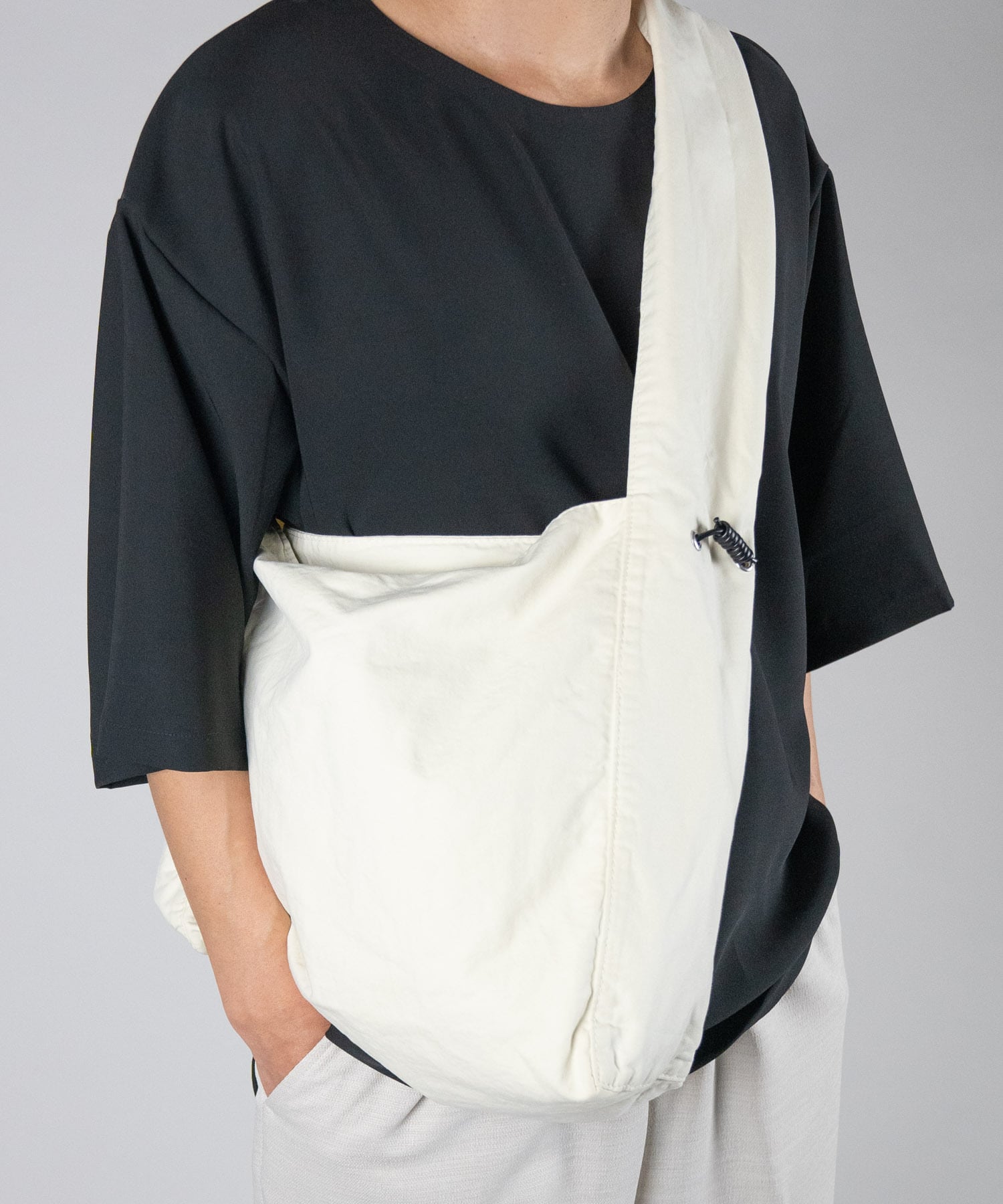 ■リングカラビナ付きのレザーコードがあしらわれたラフなコットンショルダーバック