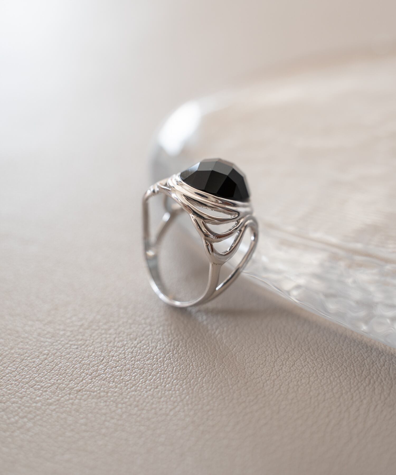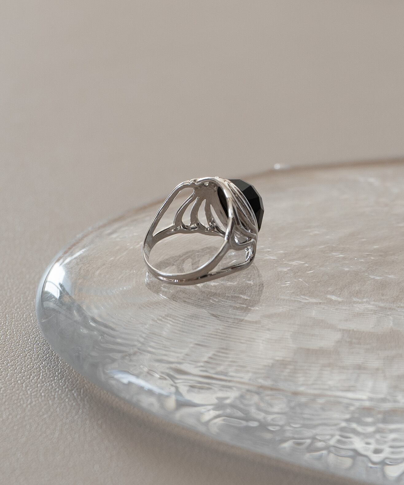 ■カッティングが施されたドーム型オニキスを配し、シルバー部分には透かし柄を入れたリング