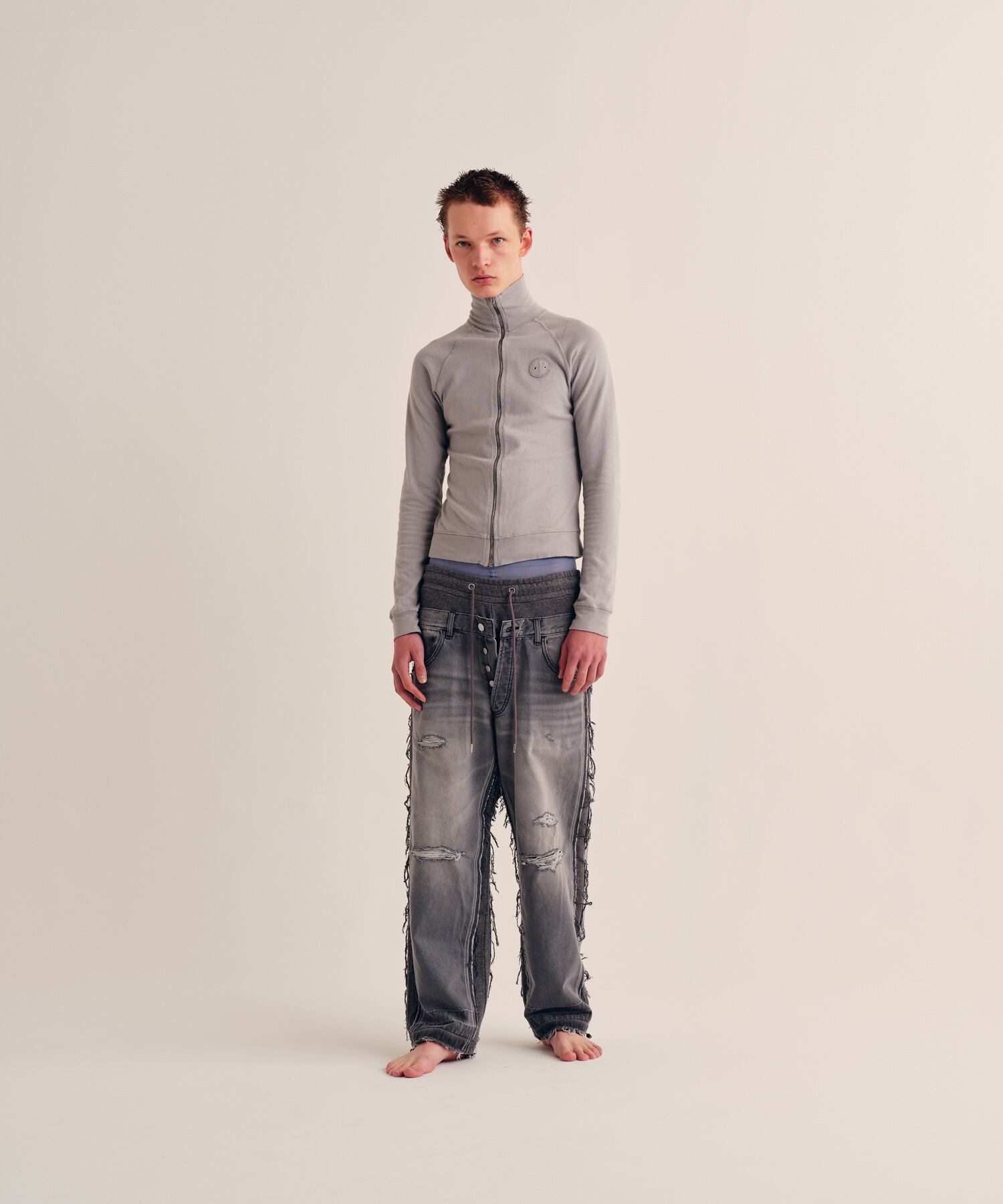 オリジナルデニムを作成しダメージ加工他、一連のユーズド加工を施した後、サイドシーム部分でステッチをほどき、ポケットを外すなど一旦解体します。その後縫製前のスエットの裁断パーツに解体したデニムをドッキングし、スエットパンツとして再構築しています。