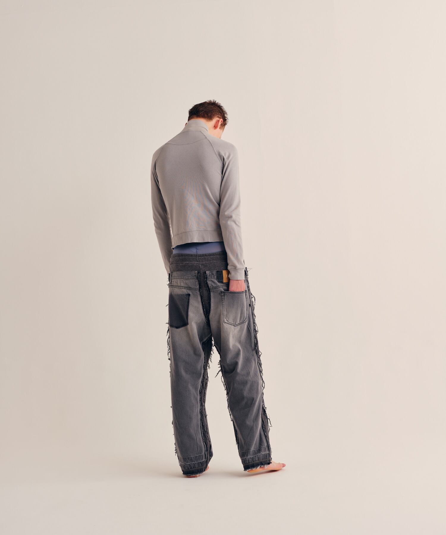 一般的なリメイクデニムとは異なり”古着のデニムを使わない”ことを特徴としリメイクの材料となるユーズド加工を施したデニムの作り込みからそれを解体、再構築する”フルオリジナルのリメイクデニム”となります。それにより、ベースの古着の良し悪しに頼ることなくシルエットやディティール、加工感を自在にデザインし完成度が高く、洗練された、個体差の無いリメイクデニムをリリースすることを可能にしています。