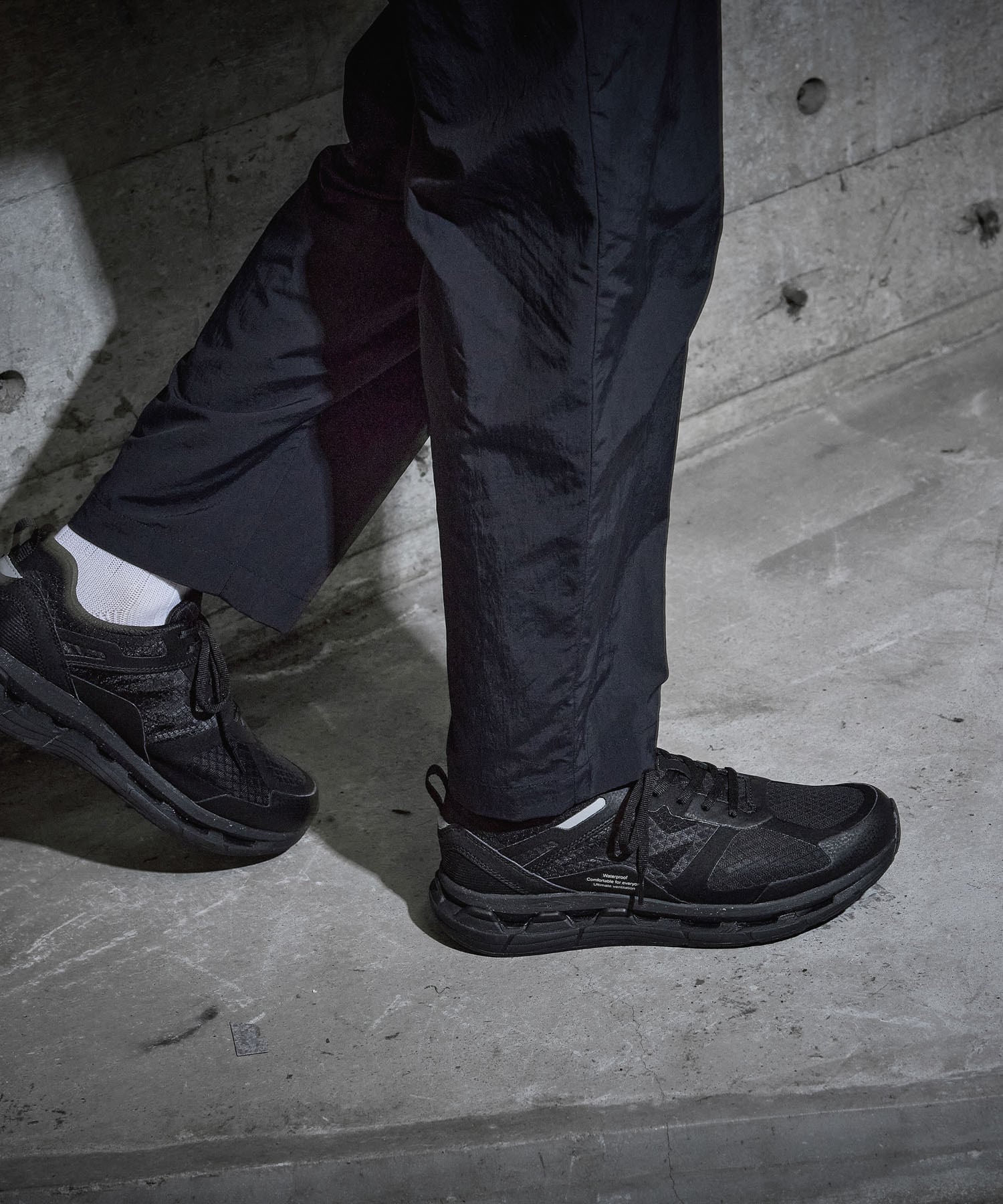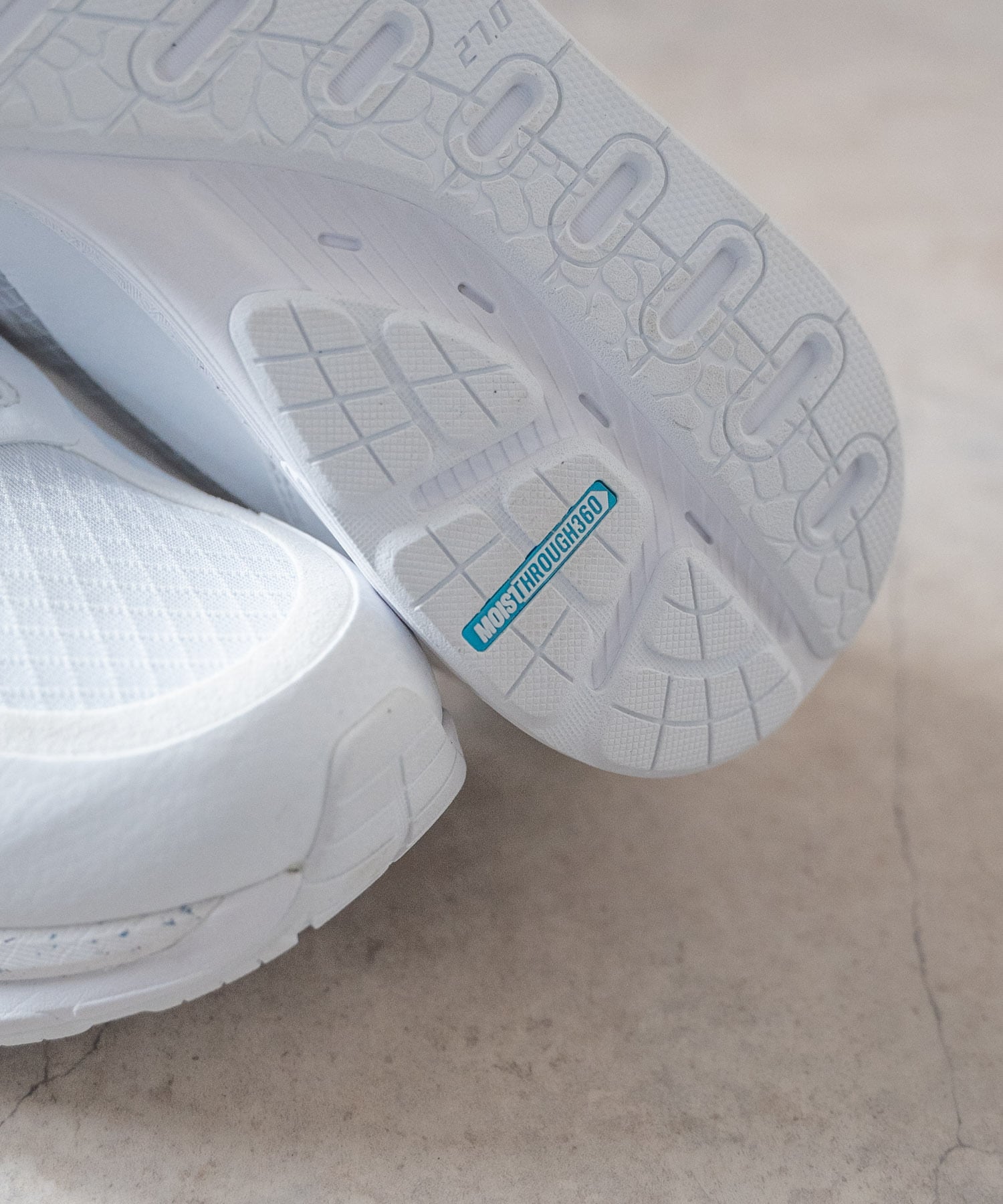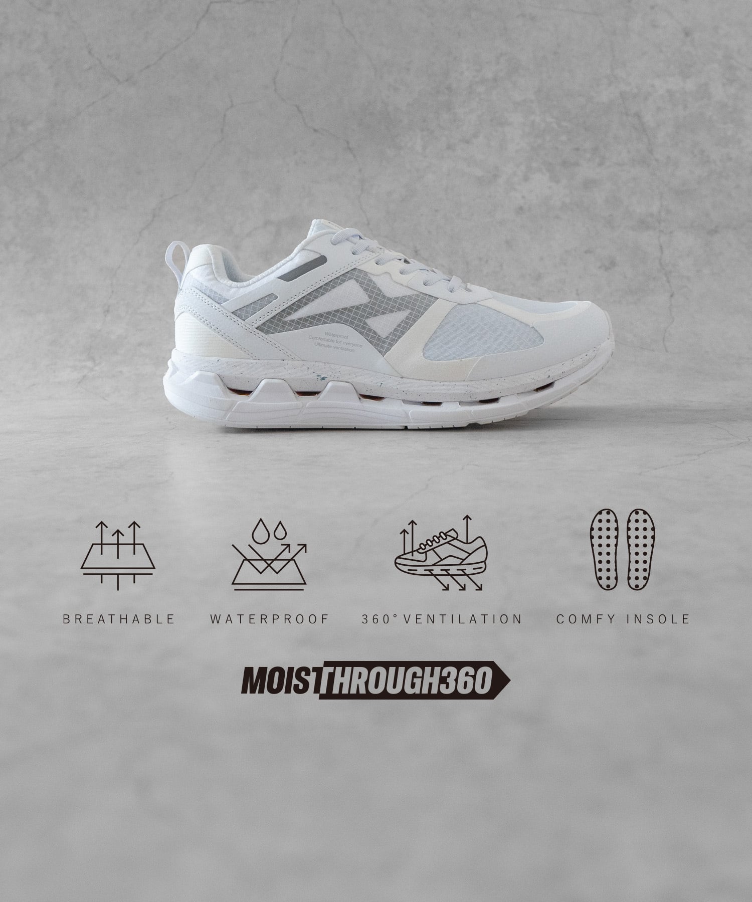 MOISTHROUGH360はそこに焦点をあて、防水フィルムの代わりに、アッパー材の全てに水を通さず空気と水蒸気をしっかりと通すことのできる強力な防水加工が施された特殊素材を用いることで、従来の防水スニーカー同様の防水性を保持しながら、